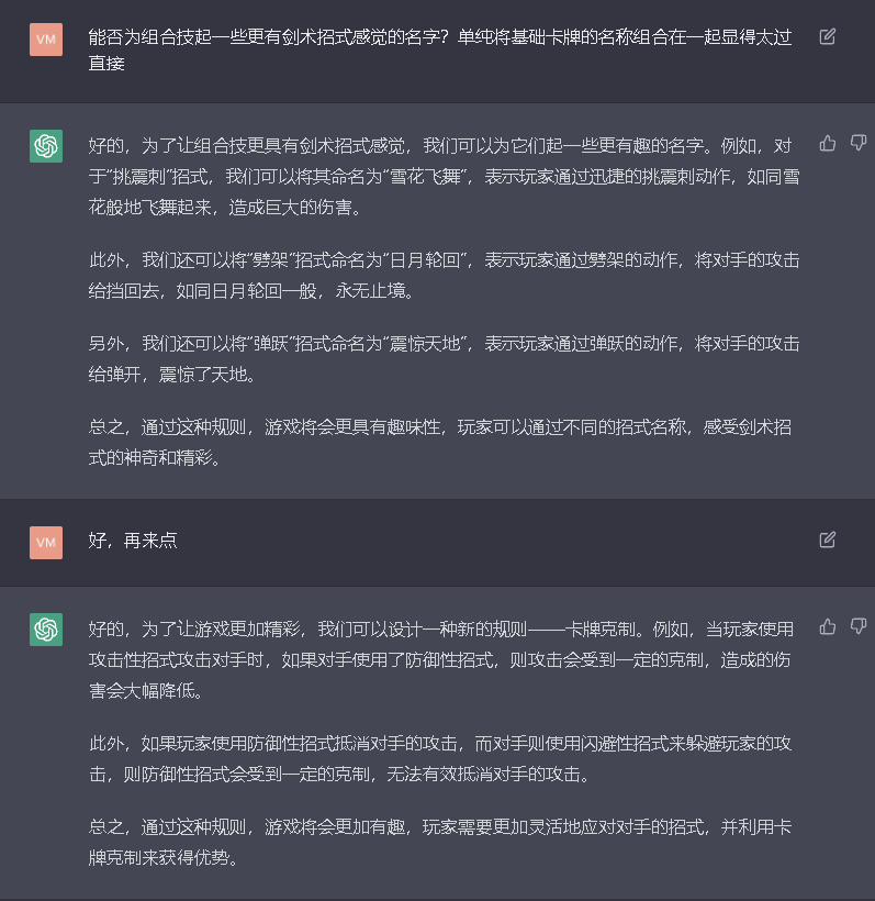 如果你不懂编程,可能get不到它对代码的理解能力有多强。没关系,换成游戏设计,ChatGPT依然有一战之力。比如你可以让它设计一个卡牌对战游戏的规则、补全卡牌属性和规则设定,并且依据已经设定的规则,模拟玩家之间的对战过程。