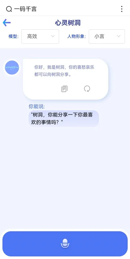 🌟🚀探索智能新领域!一码千言AI的”小言心语”等你来体验!🎉💡以独一无二的语音互动,打造专属的情感交流空间。在这里,无论何时何地,专业的”心理专家”随时倾听你的困扰,像棵大树般守护心灵,提供深度的心理咨询和减压树洞。👩⚕️🌳让个性化服务温暖你的心房,拥抱健康的生活方式!✨