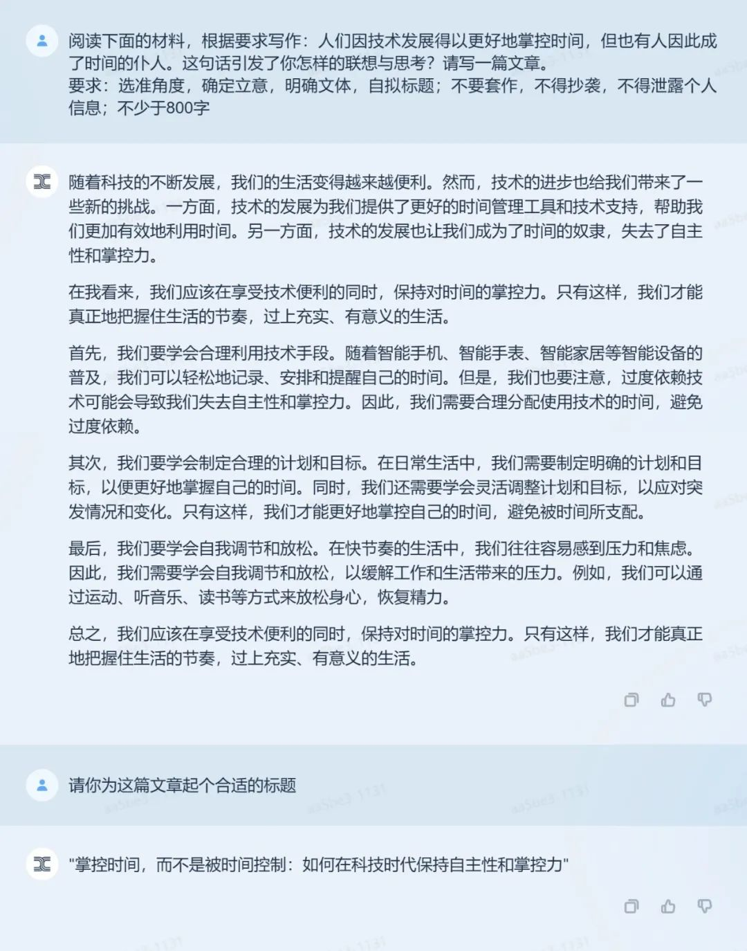 这里选择“ChatGPT、微软 Bing、文心一言、通义千问、昆仑万维「天工」、钉钉斜杠「/」、360智脑、讯飞星火” 8 款代表性产品检测大模型能力。测试标准统一,输入全国卷甲卷高考题目全文,对比各大模型产品首次生成的内容。全国卷全国甲卷作文土木要求如下——阅读下面的材料,根据要求写作。(60分)人们因技术发展得以更好地掌控时间,但也有人因此成了时间的仆人。这句话引发了你怎样的联想与思考?请写一篇文章。要求:选准角度,确定立意,明确文体,自拟标题;不要套作,不得抄袭;不得泄露个人信息;不少于800字。真金不怕火炼,一起看看各家大模型表现。ChatGPT题目《科技的发展:让人们更好地掌控时间还是失去掌控能力?》
