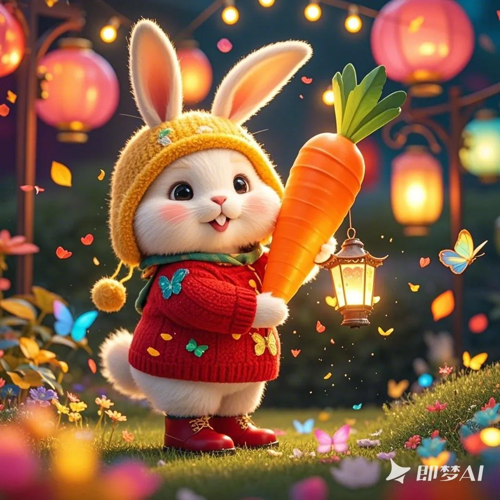 一只穿着红色毛衣、戴着金色兔耳朵帽的小兔子,手里抱着一个大大的胡萝卜灯笼,背景是挂满彩灯的花园,周围有飘落的花瓣和蝴蝶,画面充满节日的浪漫氛围。喜庆、胡萝卜灯笼、彩灯、花瓣、蝴蝶、小兔子。