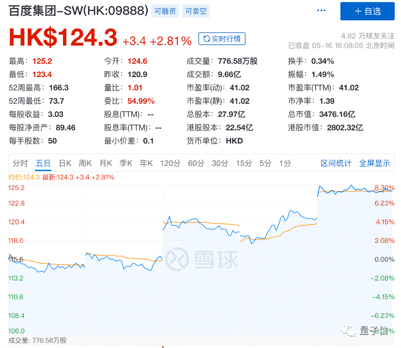 今日港股开盘,百度集团涨超3%。收盘价124.3港元,涨幅为2.81%。